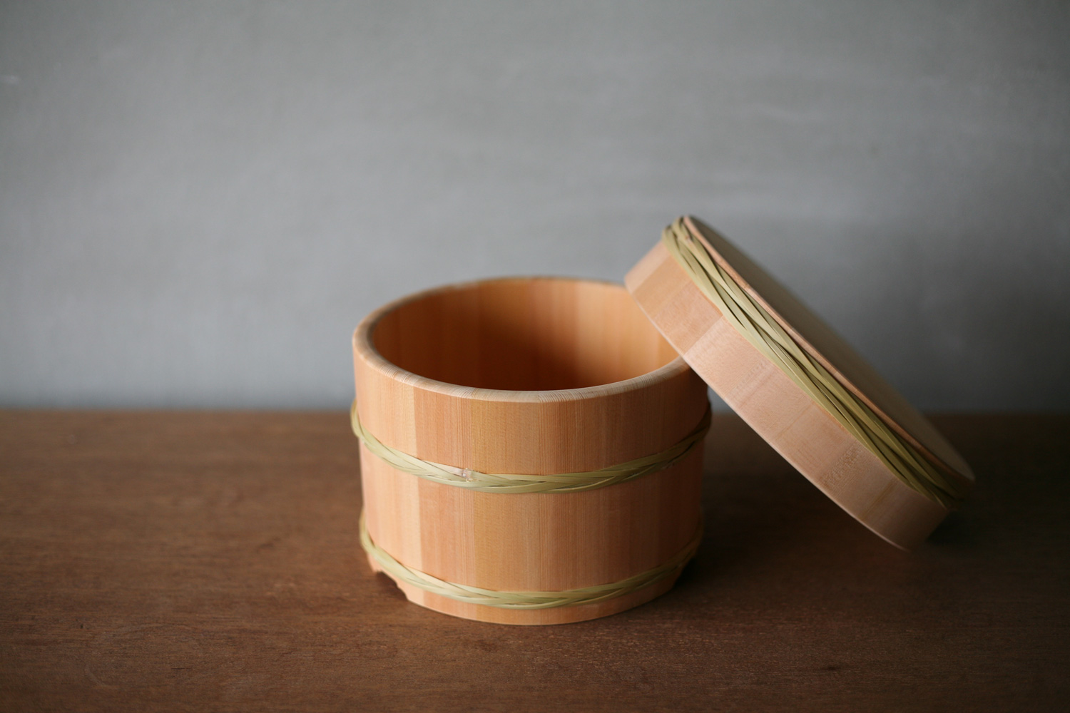 The bamboos are woven in a time-consuming but sturdy "gui-style" hoop and coiled around the ohitsu. Mr. Yasuo Aoki's ohitsu is made of Kiso sawara cypress, the best material for an ohitsu which is nurtured by the harsh climate of the Shinshu Kiso region.
