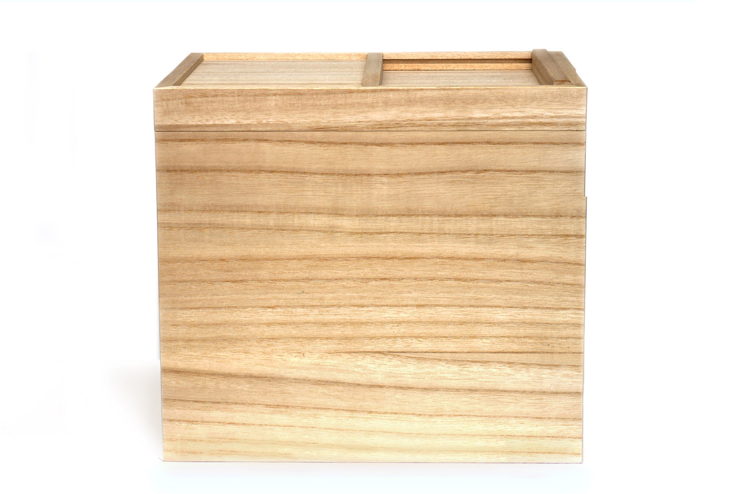 Ningún clavo está utilizado para fabricar esta caja hecha de espesas piezas de madera de paulownia pura. Los granos de arroz que están en la caja se quedan completamente secos cuando se cierra bien la tapa.