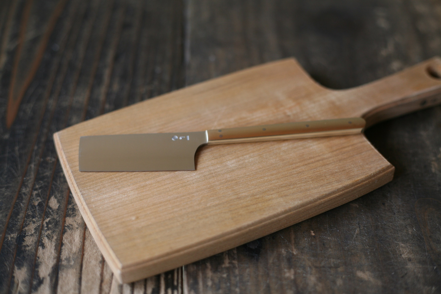 使い続けるうちに、真鍮の柄は光沢が落ち着き、深く柔らかな飴色に変化していきます。きちんと選ばれた素材と製法を用いていますので、研ぎ直しがきき、気持ちよく使い続けることができます。どうぞ末永くご愛用ください。 |