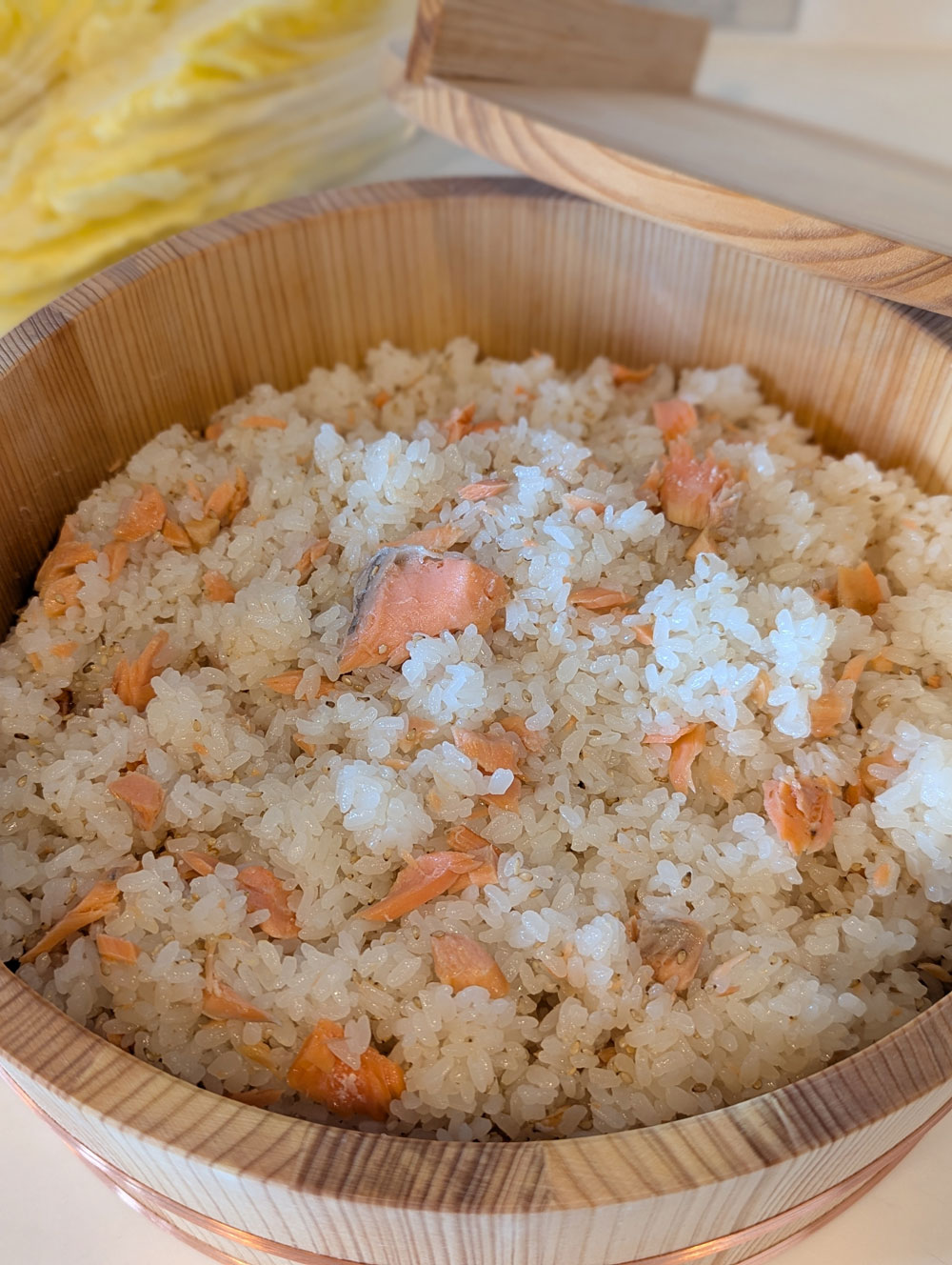 ■飯台を頂戴しました。今日は鮭の寿司飯で小さい方のデビューです。先日届いてすぐに洗って乾かしたので、今日は浸してからすぐに使えました。木のとてもよい香りがします。目も鼻も手触りも、きっと盛りつけられているごはんも気分が上がっていると思います。おかげさまで寿司飯の水分もちょうどよくでき上がりました。一代目は大きい方、26年使いました。今回は大小両方です。長く大切に使います。ありがとうございました。