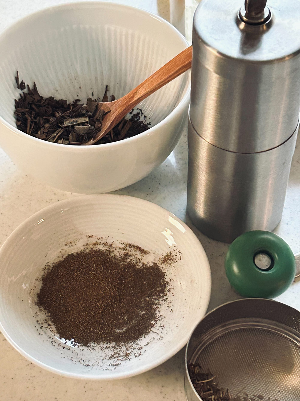 お茶ミルは、「2017かごしまの新特産品コンクール」において、鹿児島県知事賞を受賞しました。18ミクロンまで挽くことができる最新型です。ミルで茶葉を細かく挽くので茶殻も出ず、また茶葉の栄養分を丸ごと摂ることができます。緑茶ラテ、アイスグリーンティー、スイーツやお料理のアクセント、緑茶塩などとしてお楽しみください。