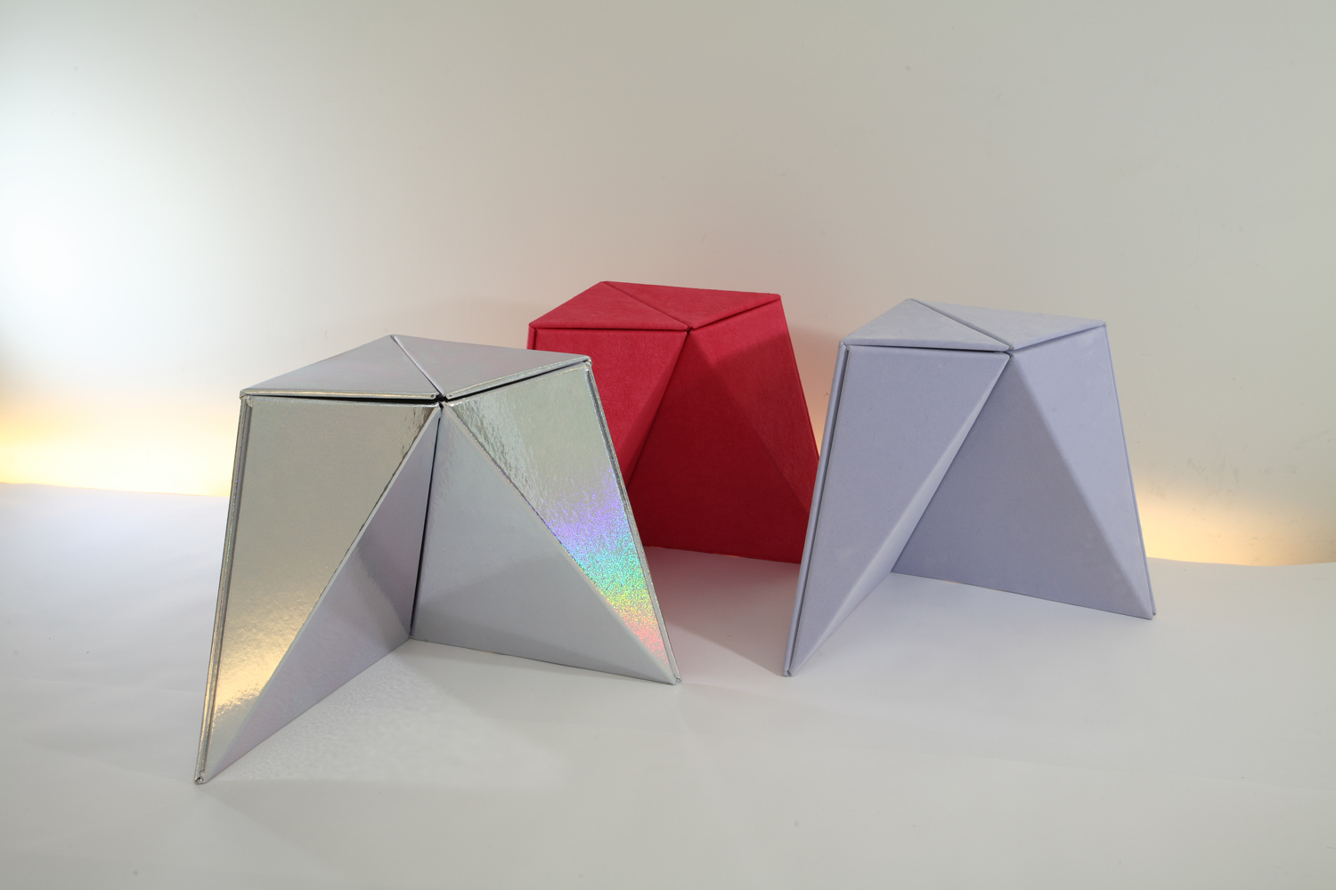 1983年、最初に作られたオリガミスツールは、四半世紀を経て2009年7月一般販売を開始。空間デザインを専門とする会社様から定期的にご注文を承っております。一枚の紙を折り紙のように折ることによって形作られる、端正なデザインのスツールです。海外からも頻繁にご注文を頂いております。