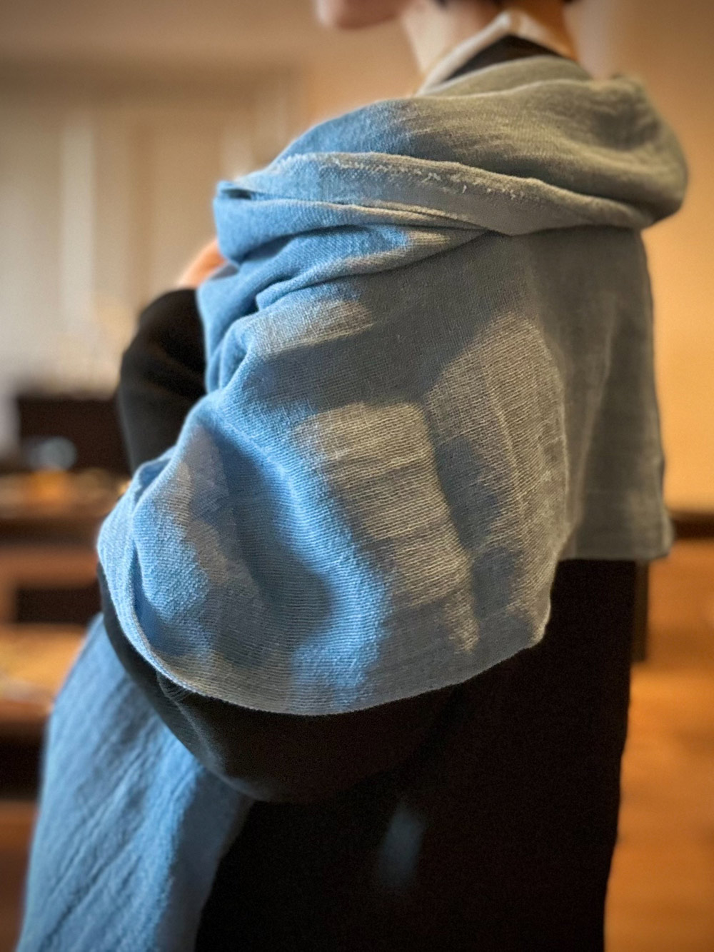 這款大尺寸披肩式圍巾,採用凝聚奈良傳統工藝的蚊帳面料,並以藍染精心染製而成。雖擁有190x110cm的寬大尺寸,卻輕盈得令人驚嘆,佩戴時彷彿披覆著空氣一般自在。面料採用粗平織工藝,薄至幾乎透光,具備優異的透氣性與吸水性,即使在炎熱季節也能保持乾爽觸感,不易悶熱。寬闊的布面能夠充分包裹空氣,在微涼時節,則以輕柔的暖意呵護頸間。這種隨著使用愈發柔軟、愈加貼合肌膚的質感,一旦上身,便令人愛不釋手。
